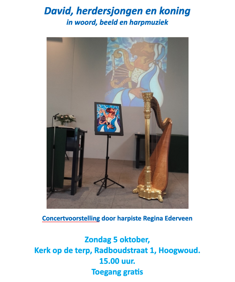 Op zondag 5 oktober begint de dienst om 15.00 uur. Het is dan Zondag van Kerk en Jodendom. Het onderwerp van de zondag is: “David in woord, beeld en harpmuziek. Beroepsmusicus en harpiste Regina Ederveen zal tijdens deze dienst op haar harp met gouden klanken spelen en een voorstelling geven over David, herdersjongen en koning. Regina laat op haar harp muziek horen uit allerlei stijlperiodes: Klassiek, Joods en Modern. Ook laat ze eigen improvisaties op de Psalmen van David horen. Ook wij worden bij de dienst betrokken door het zingen van een aantal bekende liederen. Verrassende visuele elementen ondersteunen het geheel. Deze middag wordt georganiseerd door het Provinciale Platform kerk en Israël Noord Holland in samenwerking met de protestantse gemeente Midden Westfriesland. De toegang is gratis en na afloop zijn er (joodse) hapjes en drankjes.